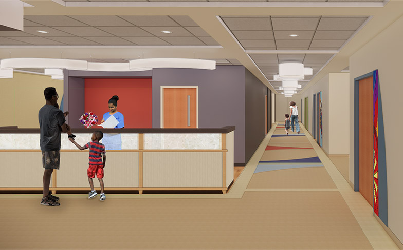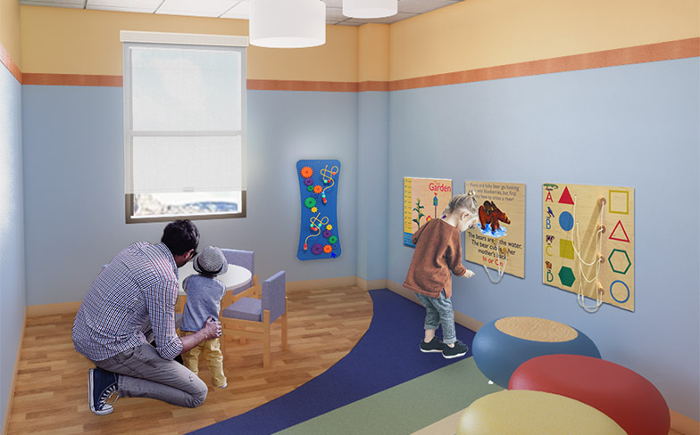 Maybe most exciting for the children, the upgrades include a community playroom. Currently, all toys available for children to play with are sitting on a small desk with no real space to spread out and play. The community playroom will provide a much-needed break for children physically able to take one. It will feature natural light, bright, happy colors and seating for parents and caregivers.